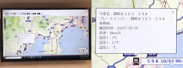 モニターの1台は倉庫内やパース内などのカメラ映像用、そしてもう1台は車両の動態管理用として24時間稼働しています。お預かりした食品を、安全に鮮度を保ってお届けするため、弊社は今後とも設備の充実を図ってまいります。