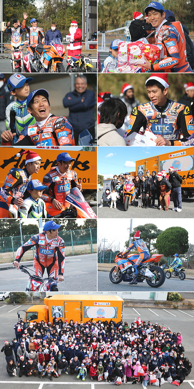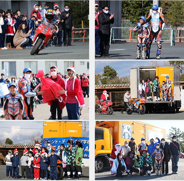当日は、弊社がスポンサー支援している、エスパルスドリームレーシングチームの生形秀之選手に加え、同チームが育成している小学生ライダー齊藤太陽選手による、バイクのデモンストレーションランと記念撮影を行いました。今年は新型コロナ感染症対策のため、生形選手はプレゼンターとして、代表の生徒の皆さんにクリスマスプレゼントのお菓子を手渡しました。