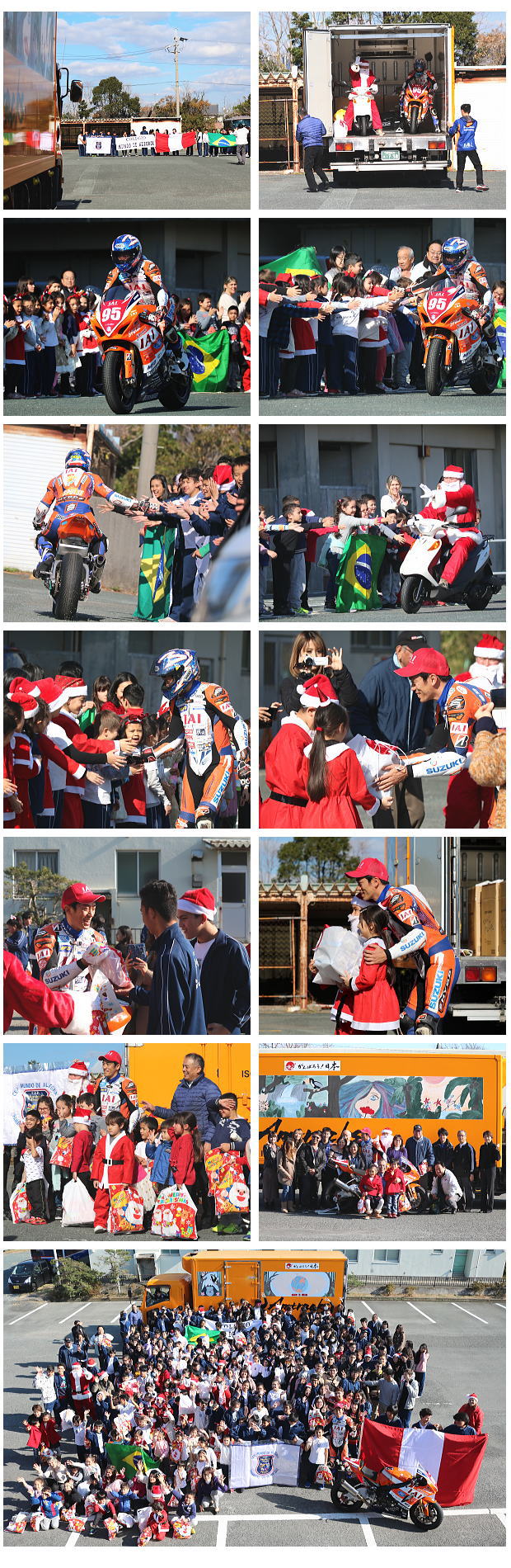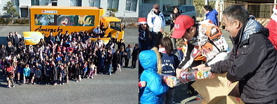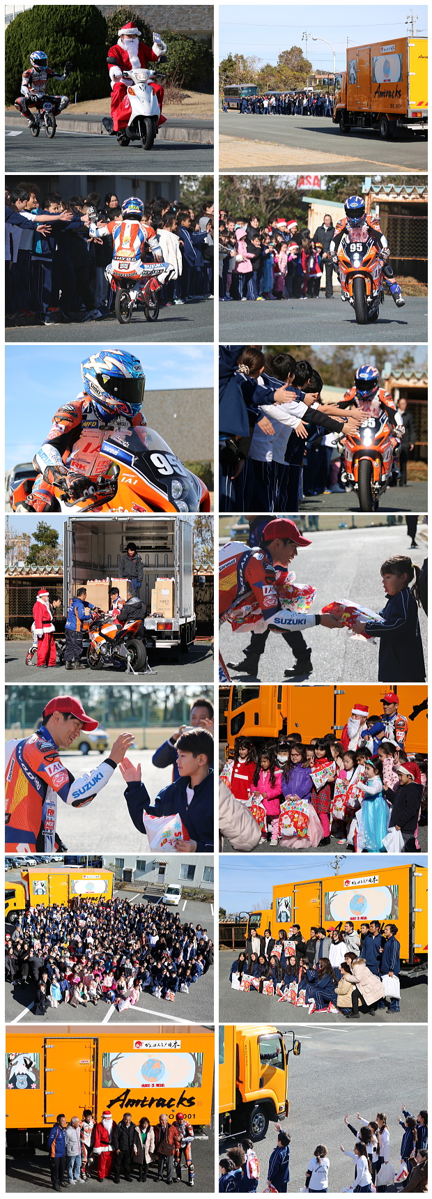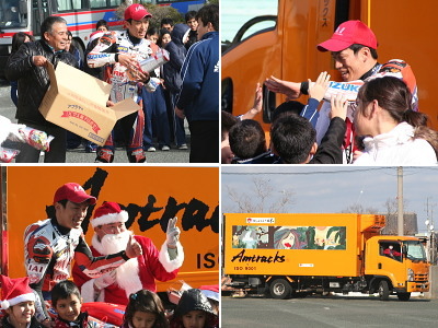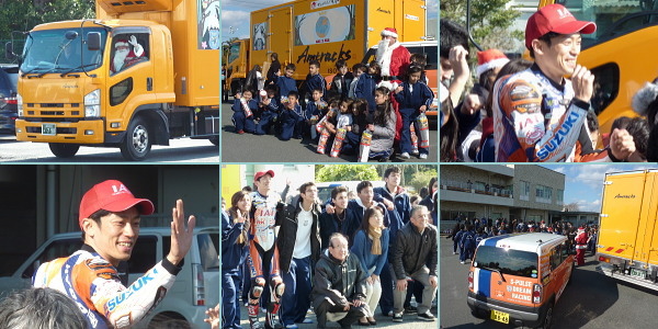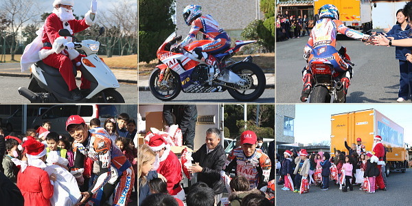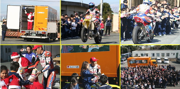 当日は、弊社がスポンサー支援している、エスパルスドリームレーシングチームの生形秀之選手による、バイクのデモンストレーションランと記念撮影を行いました。また生形選手はプレゼンターとして、握手をしながら生徒の皆さんにクリスマスプレゼントのお菓子を手渡しました。
