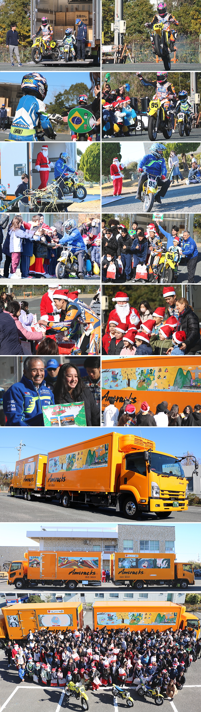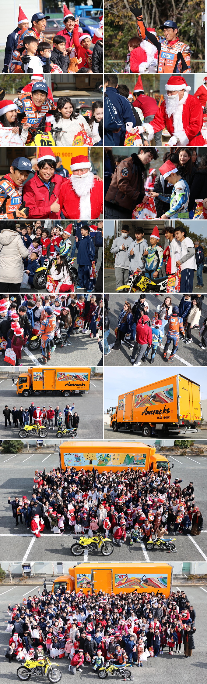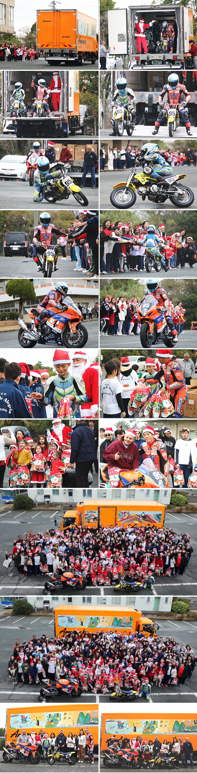 当日は、弊社がスポンサー支援している、エスパルスドリームレーシングチームの生形秀之選手による、バイクのデモンストレーションランと記念撮影を行いました。また生形選手はプレゼンターとして、握手をしながら生徒の皆さんにクリスマスプレゼントのお菓子を手渡しました。