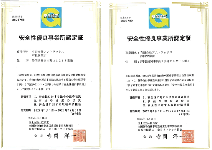 弊社ではこの認定を受け、これからも引き続き社員全員で安全輸送に努めてまいります。どうぞアムトラックスをご用命くださいますよう、お願い申し上げます。